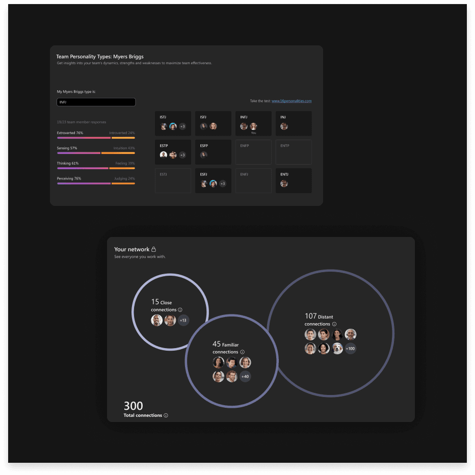 Our team shifted from personality categorization to a connection-focused solution that allows users to reach out to colleagues and track the organic growth of their network.