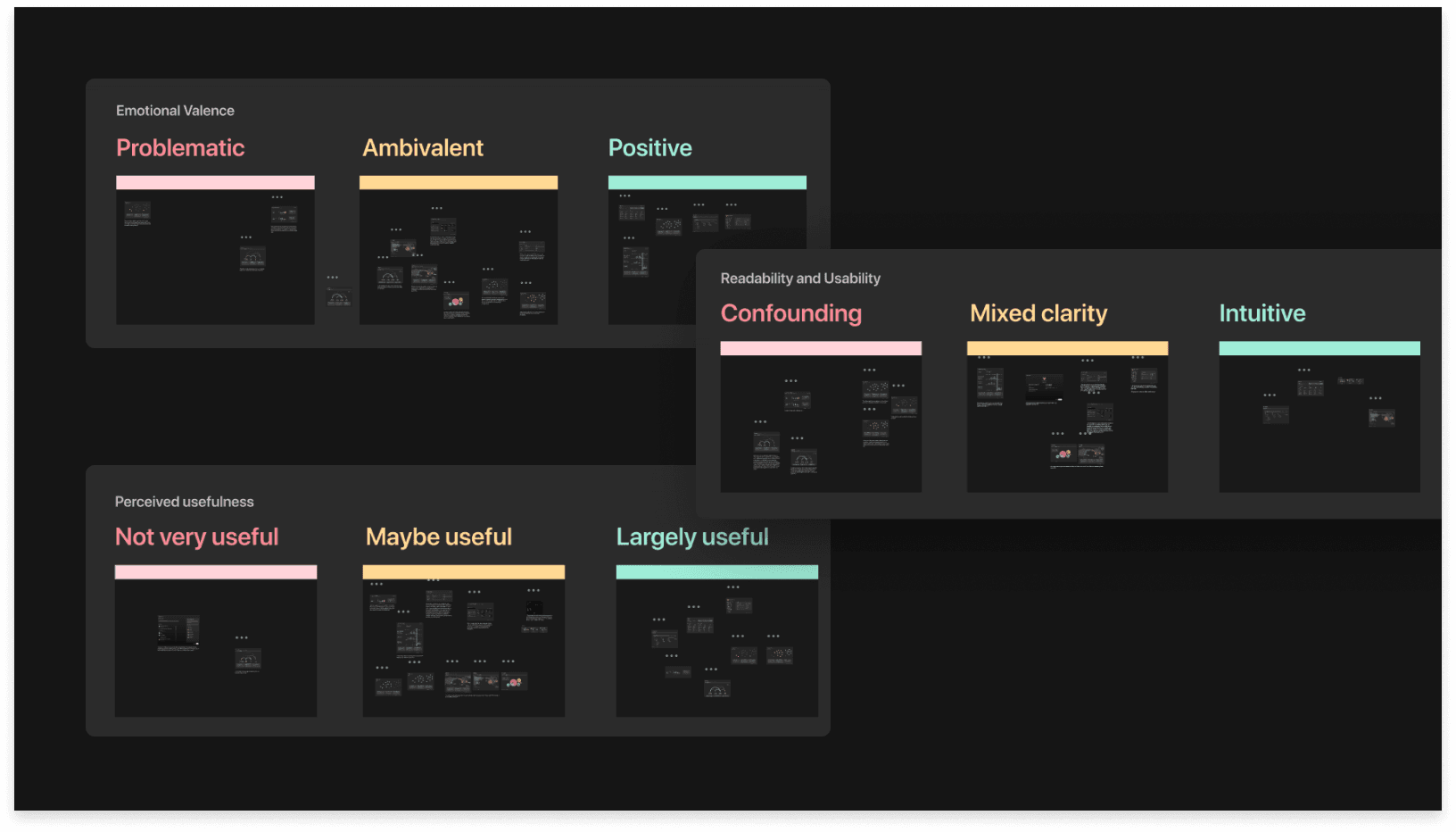 Based on our research findings, we organized our ideas according to emotional valence, readability, usability, and perceived usefulness, allowing us to streamline our potential solutions.